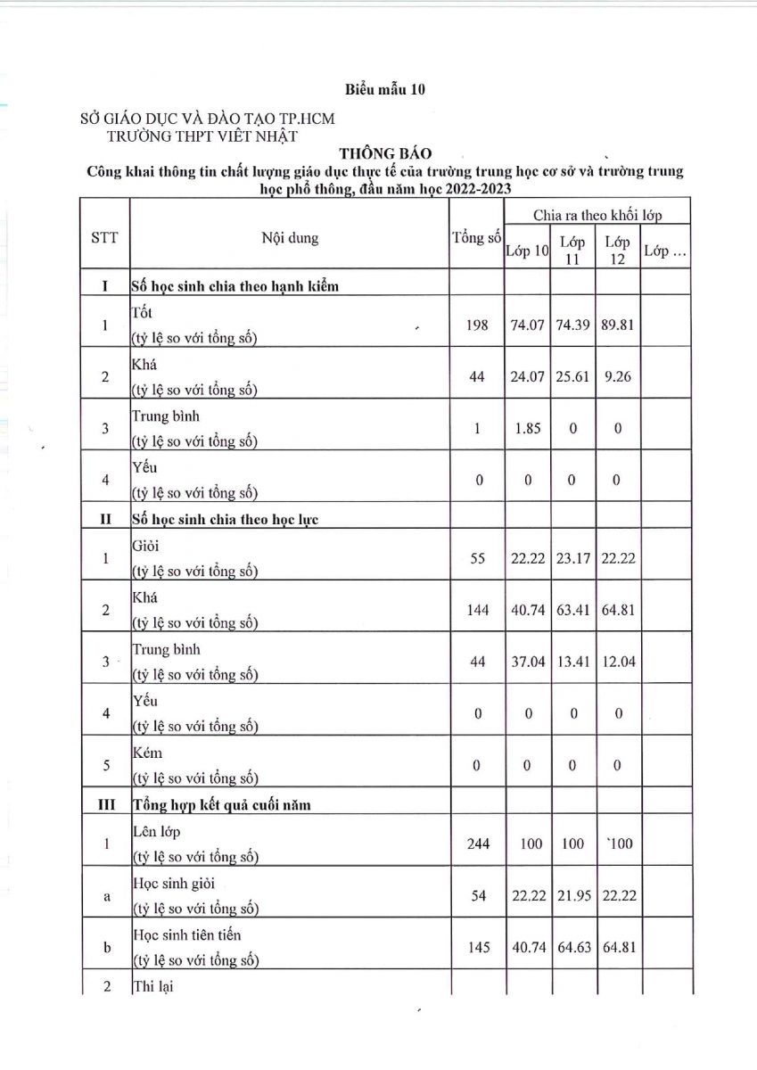 Công khai thông tin chất lượng giáo dục thực tế trường THPT Việt Nhật đầu năm 2022-2023