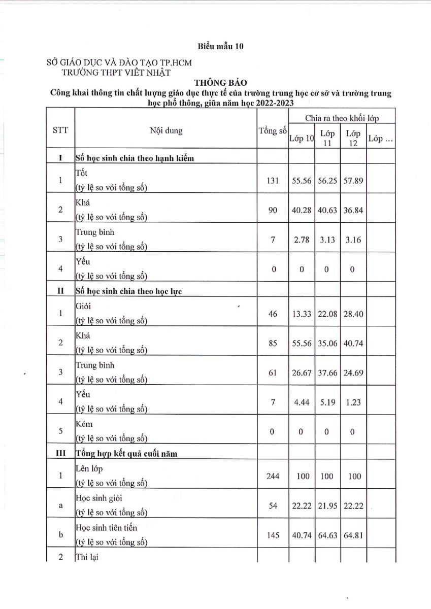 Công khai thông tin chất lượng giáo dục thực tế trường THPT Việt Nhật giữa năm 2022-2023