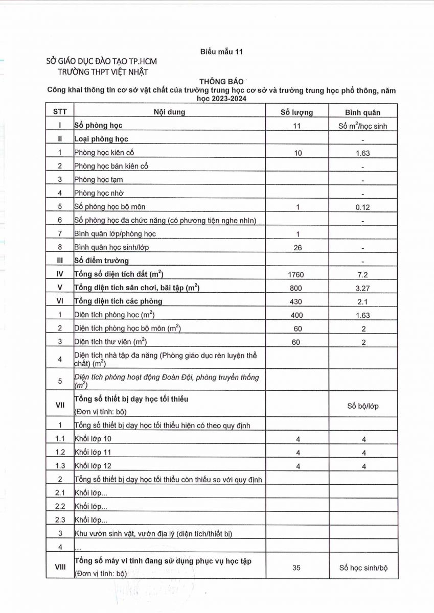 Công khai thông tin CSVC trường THPT Việt Nhật đầu năm 2023-2024