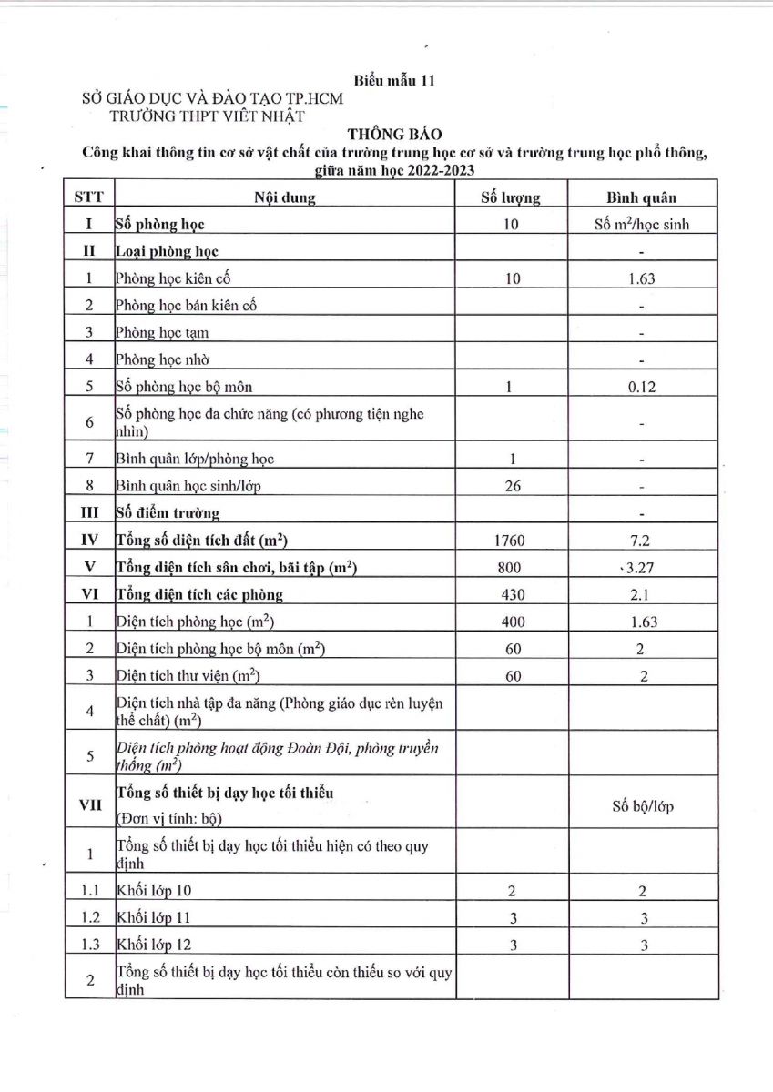 Công khai thông tin về CSVC trường THPT Việt Nhật giữa năm 2022-2023